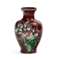 Cloisonné enamelled metal, the base with "Pure silver" mark, red ground, one side with a polychrome decoration of chrysanthemum and plum flowers, the other side with a ton-sur-ton bamboo..