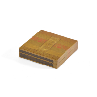 Lacquered and gilded wood, finely decorated with abstract and geometric motifs, the center of the upper side of the lid with a rectangular cartouche inscribed with 伊勢物語 (“Ise Monogatari”).
