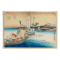 Large-format polychrome woodblock print (oban) from the series “Fifty-three Stations of the Tokaido”.