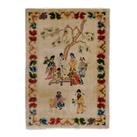 Ochre ground and polychrome decoration of deities in the landscape, border with stylised clouds and bats.