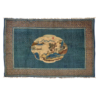 The centre with a polylobed medallion with a landscape with a figure reserved on a ground of stylised flowers, border with floral decoration.
