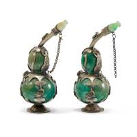 Carved soapstone, the upper part with Buddhist lions, the lower part with shrines with Taoist sages.