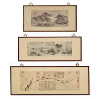 Reproductions of Chinese painting masterpieces within wooden frames and protective glass.