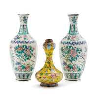 Enamelled metal, one with a yellow ground and a polychrome floral decoration with an apocryphal Qianlong mark to the center of the base; the pair with a white ground and a polychrome floral decoration.