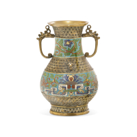 Metal with polychrome cloisonné enamel decoration, the two handles as a stylised dragon, the decoration with vegetal racemes and geometric bands.