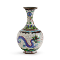 Polychrome cloisonné enamelled metal, white ground with dragons, the neck with floral motifs.