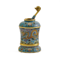 Polychrome cloisonné enameled metal, the container decorated with dragons flying amidst clouds and darts over sea waves and lotus flowers, the spoon with a dragon's head handle.