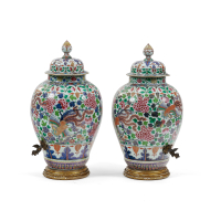 Porcelain painted with polychrome enamels and gold, the body with an exuberant decoration of phoenixes flying amidst floral arabesques, the compressed lid surmounted by a pine cone handle, both adapted 'ab antiquo' as a fountain with the insertion in the lower area of
