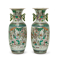 Porcelain painted with polychrome enamels, decorated with figures in a landscape with pavilions, stylized handles.