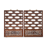 Finely carved wood with floral and geometric motifs, two medallions with mythological animals at the bottom, metal accessories.