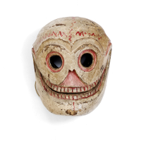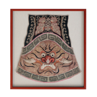 Partially padded polychrome silk, depicting a demonic mask within a geometric border, a butterfly at the top, wooden frame and protective glass.