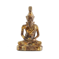 Carved and painted wood, the deity depicted with legs bent at the knee.