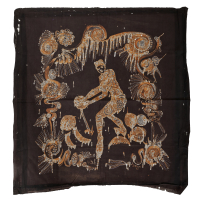 Brown ground batik with orange decoration, figure and abstract motifs, signed and dated in the lower right "Bram 72".