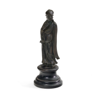 Bronze, the standing taoist immortal wearing a loose robe, his arm bent at the elbow and pointing upward, glued to the wooden base.