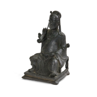 Bronze, the Taoist deity seated on a chair, his right arm bent at the elbow and raised upwards.