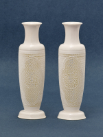 Porcelain, the external surface worked in imitation of bronze in relief with floral arabesques and elephant head handles, the body with two reserves painted in cobalt blue, one with a landscape and the other with a composition of bird and bamboo, incised apocryphal