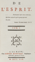 [Illuminismo]. De l'esprit di Helvetius nell'edizione stampata a L'Aja presso Pierre Moetjens del 1759 con 3 tomi in 1 volume, con frontespizio stampato in rosso e nero, entro legatura coeva in bazzana con fregi dorati e titolo in oro al dorso e tagli rossi, un read all