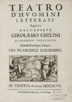 [Imperiali]. Lotto che contiene la seconda edizione del Teatro d'huomini letterati di Girolamo Ghilini nell'edizione veneziana di Guerigli del con grande vignetta incisa in rame al frontespizio, entro legatura coeva in pergamena con titolo in oro su tassello al dorso, read all