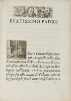 Orsino, Pier Francesco. Epigrammi sagri di Pier Francesco Orsino coll'aggiunta, e loro traduzione in verso italiano alla santità di nostro signore Benedetto papa XIII. Roma, Stamperia Camerale, 1730.