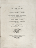 [Pernozze]. Piccolo insieme di pernozze stampate da tipografie di Parma come Paganino, Amoretti e Carmignani che usano caratteri bodoniani o si ispirano a caratteri e fregi di Bodoni. Citiamo Per le nozze del signor Giammaria Tagliasacchi di Borgo S. Donnino colla read all
