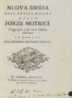 [Matematica]. Marzaglia, Gaetano. Nuova difesa dell'antica misura delle forze motrici. Verona, Dionigi Ramanzini, 1746.