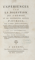 [Spallanzani]. Esemplare fresco della prima edizione francese del volume Expériences sur la digestion de l'homme et de différentes espèces d'animaux par l'abbé Spallanzani, stampata da Chirol a Ginevra nel 1783, entro legatura coeva in mezza pelle con angoli e titolo read all