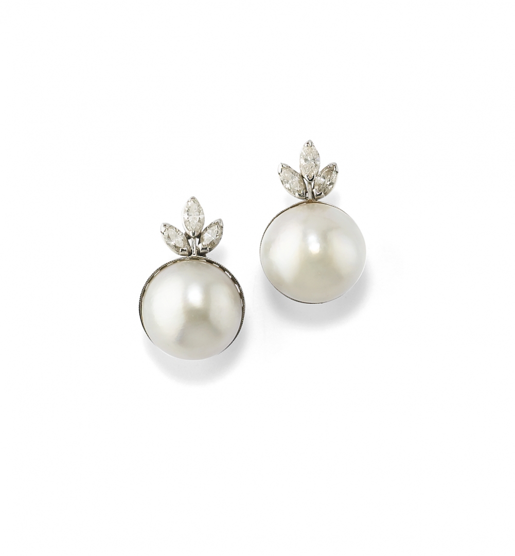 in white gold with mabe pearls surmounted by marquise-shaped diamonds weighing approx. ct 1,00.