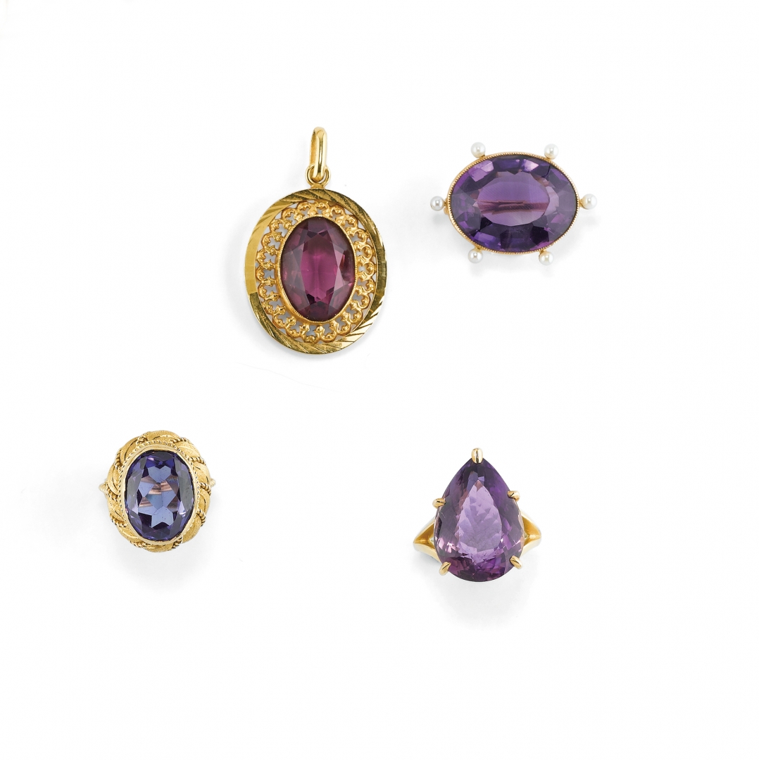 including one ring with synthetic oval amethyst, one with a pear-cut amethyst weighing approx. 15.00 ct, a brooch from the late 19th century with an oval amethyst weighing approx. 22.00 ct and pearls, and an oval pendant with a synthetic amethyst.