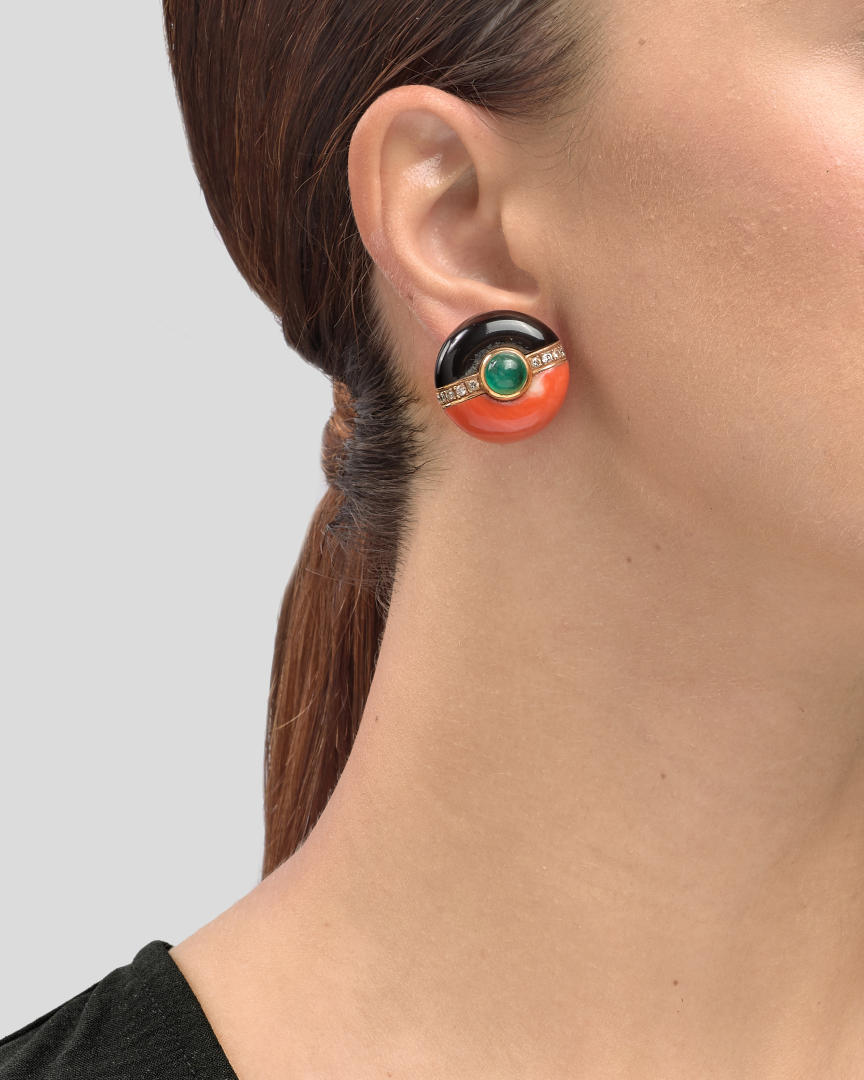 in yellow gold earrings designed with coral, onyx, diamonds, and emerald cabochons. Circa 1920s/1940s.