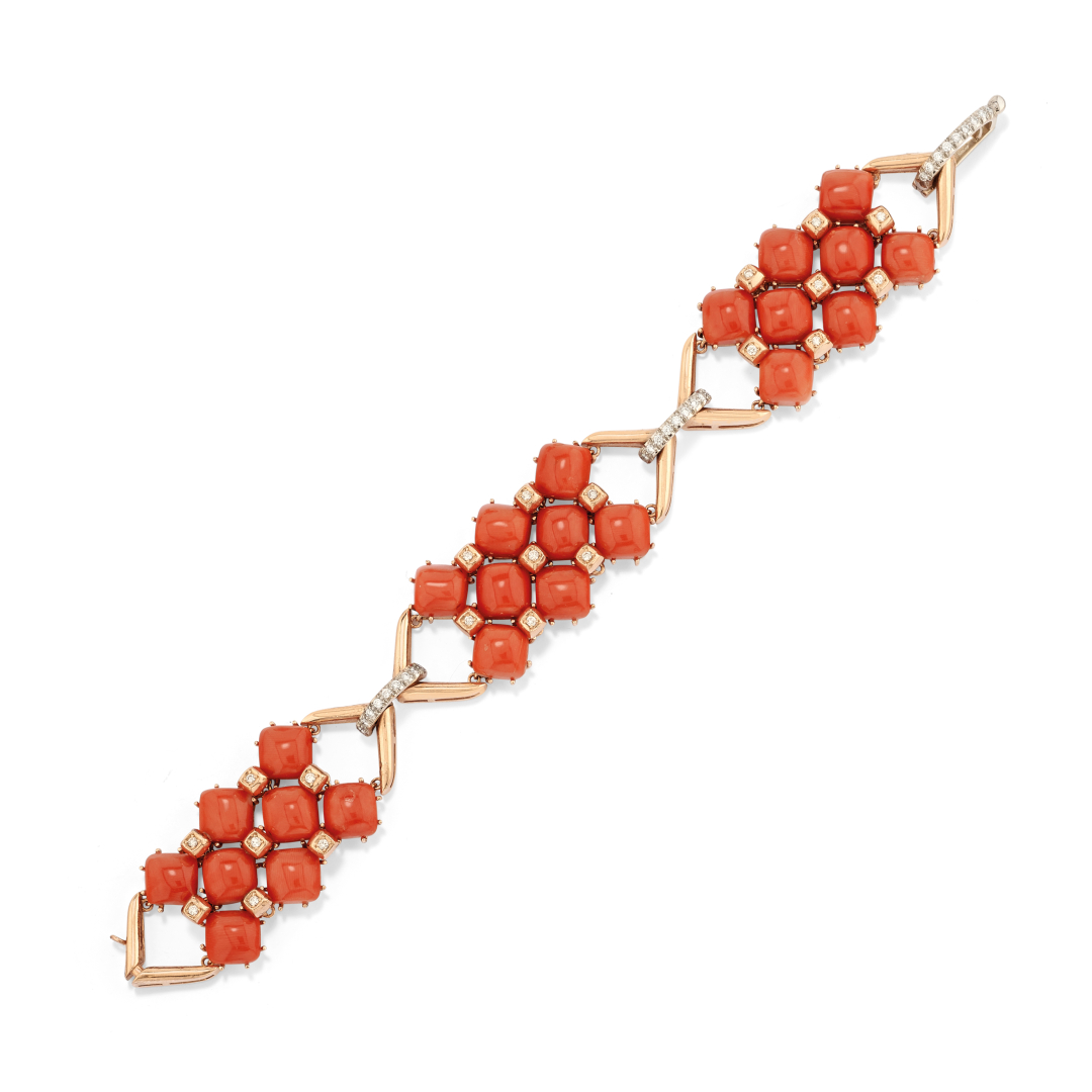 in yellow and white gold 14kt with geometric links and polished rhomboid coral buttons, interspersed with diamonds in yellow gold settings, in a beehive motif.