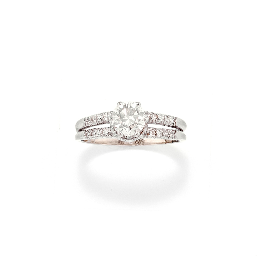 In white gold with modern round brilliant-cut diamond weighing approx. 0.90 ct and huit-huit cut diamonds on the shank.