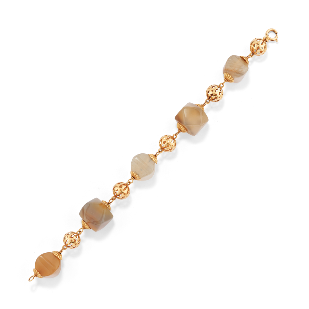 in yellow gold, designed with geometric elements in chalcedony (agate variety), interspersed with small yellow gold spheres.