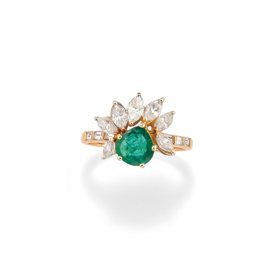 including a necklace, a ring and a pair of earrings with round brilliant, marquise and baguette-cut diamonds weighing approx. 7.00 ct and emeralds of various cuts weighing approx. 4.00 ct.