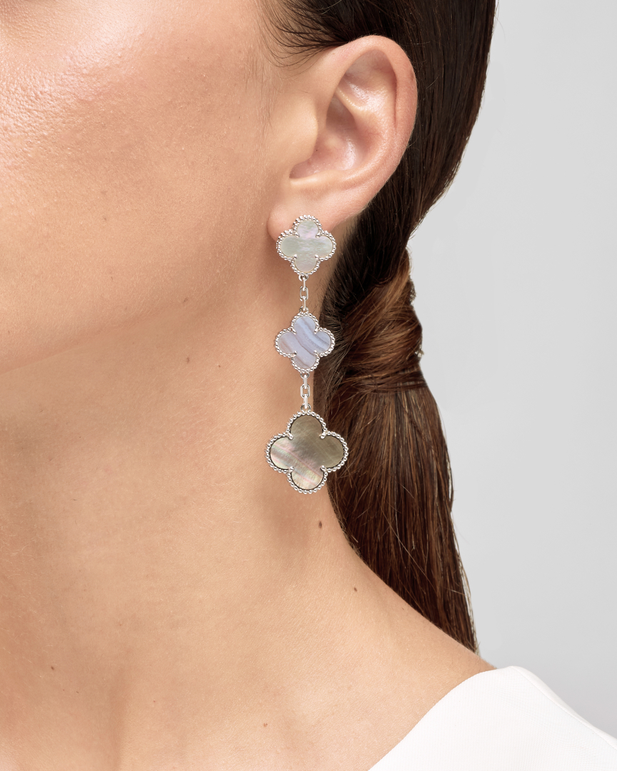 three Magic Alhambra motifs designed in white and gray mother-of-pearl and chalcedony. Signed Van Cleef & Arpels with a Van Cleef & Arpels certificate and guarantee.