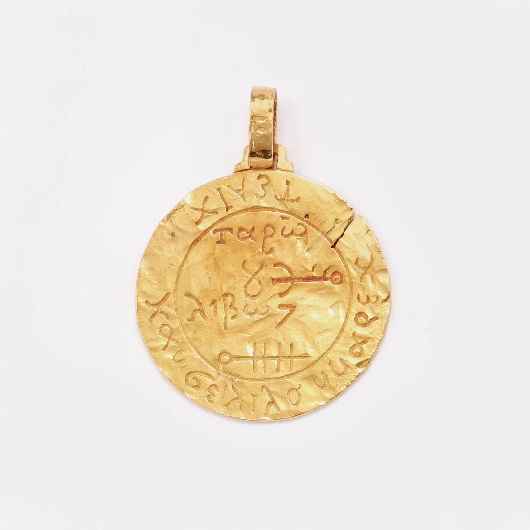 in yellow gold depicting the Taurus zodiac sign and featuring Greek engravings.