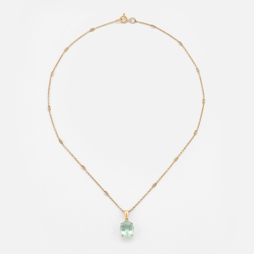 in yellow gold with links interspersed with lozenge-shaped motifs and an aquamarine pendant.