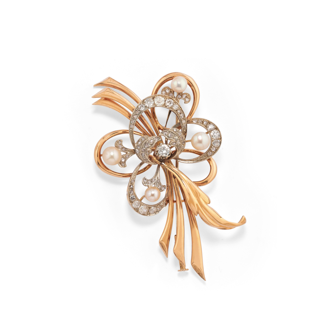 with a floreal design with pearls, modern round-brilliant cut, Old Mine-cut and rose-cut diamonds.