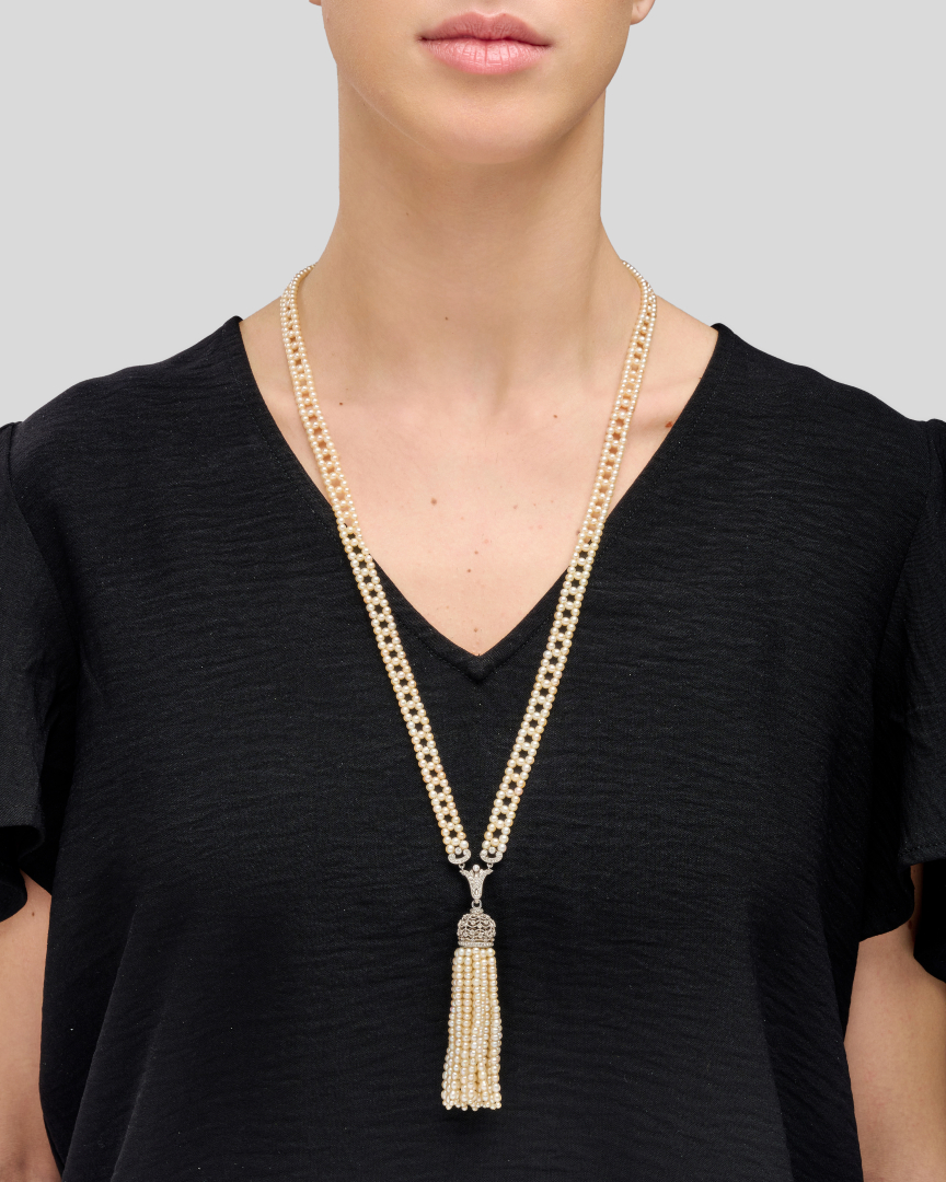 suspending a tassel pendant with white gold elements and rose-cut diamonds.