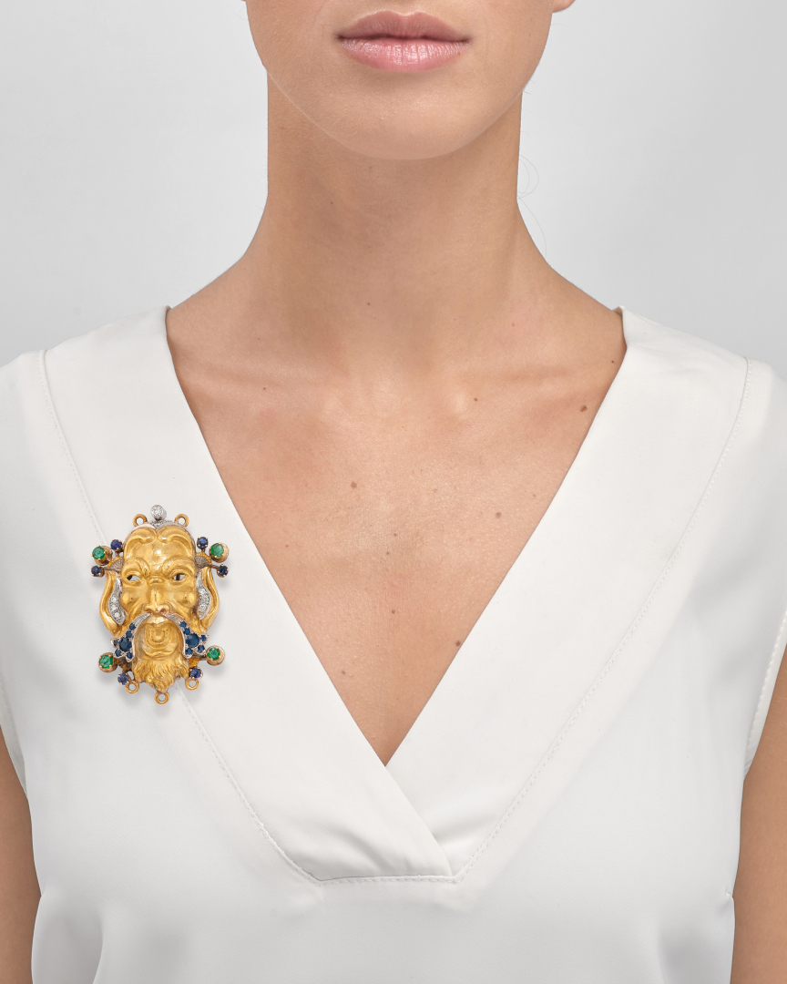 in yellow gold, diamonds and coloured gems, depicting a face. Signed Cazzaniga Roma.
