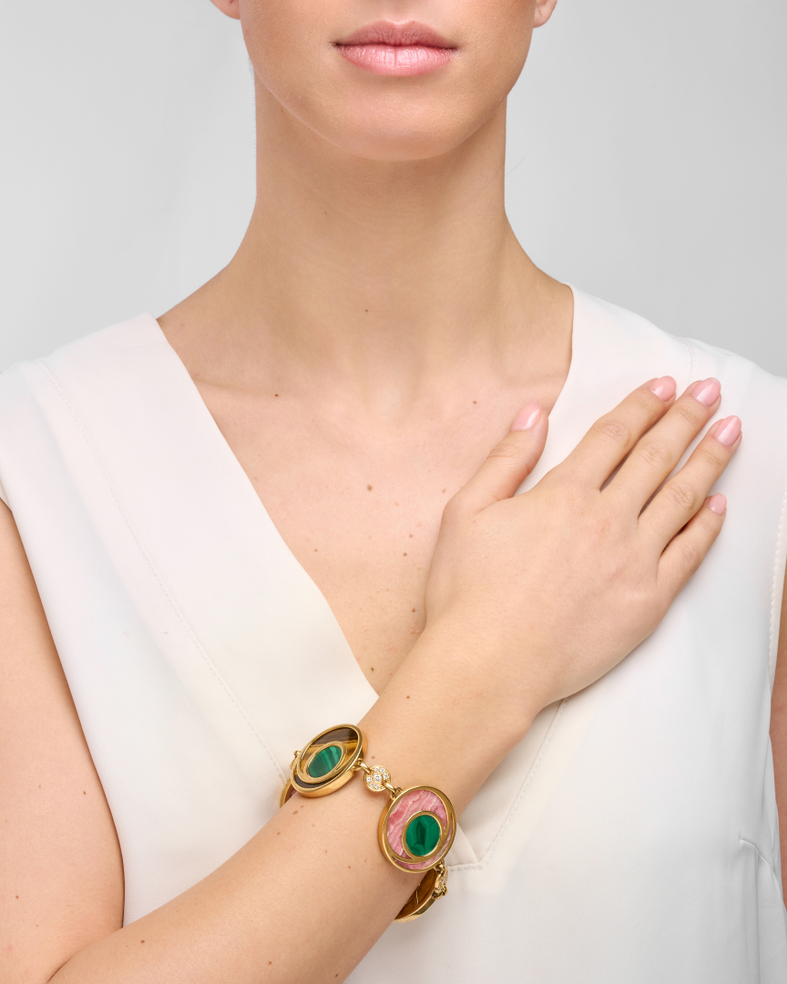 in yellow gold with round settings holding malachite, tiger's eye and rhodochrosite.