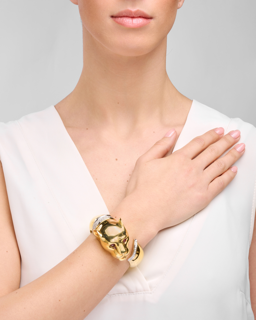 in yellow gold, of rounded design depicting a panther with tail and collar highlighted with pavé-set diamonds, red stone eyes, and easy-open clasp.