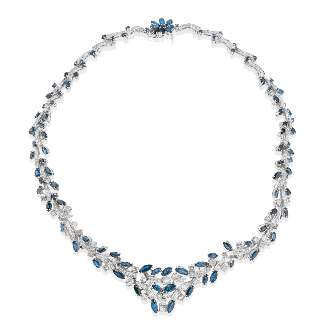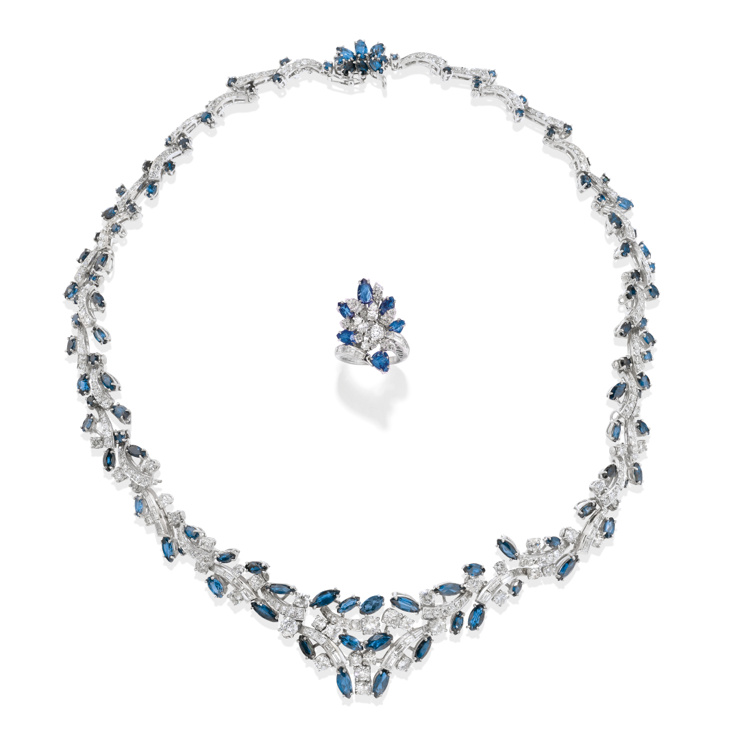 in white gold, the necklace designed as geometric elements with baguette, round brilliant- and simple-cut diamonds weighing approx. 15.00 ct and marquise-cut sapphires and blue stones weighing approx. 15.00 ct. The ring highlighted with baguette and round brilliant-cut diamonds weighing approx. 1.30 ct and pear-cut sapphires weighing approx. 1.50 ct.