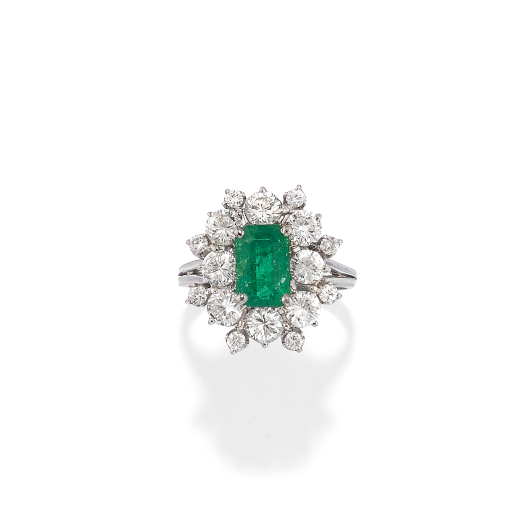 in white gold set with a rectangular step-cut emerald weighing approx. 1.50 ct framed by diamonds weighing approx. 1.60 ct.