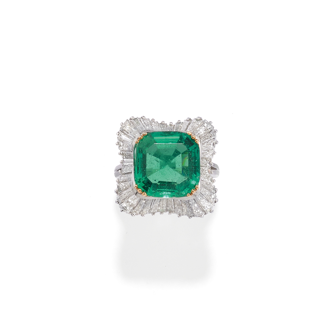 in platinum with diamond baguettes weighing approx. 2.00 ct framing a square step-cut emerald weighing approx. 6.00 ct in a yellow gold prong setting.