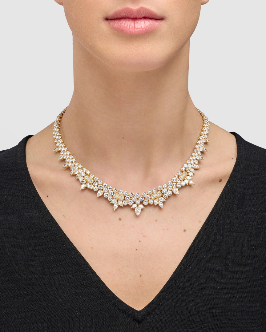 in yellow gold with square-cut diamonds weighing approx. 2.00 ct, pear-cut diamonds weighing approx. 8.00 ct and round brilliant-cut diamonds weighing approx. 33.00 ct.