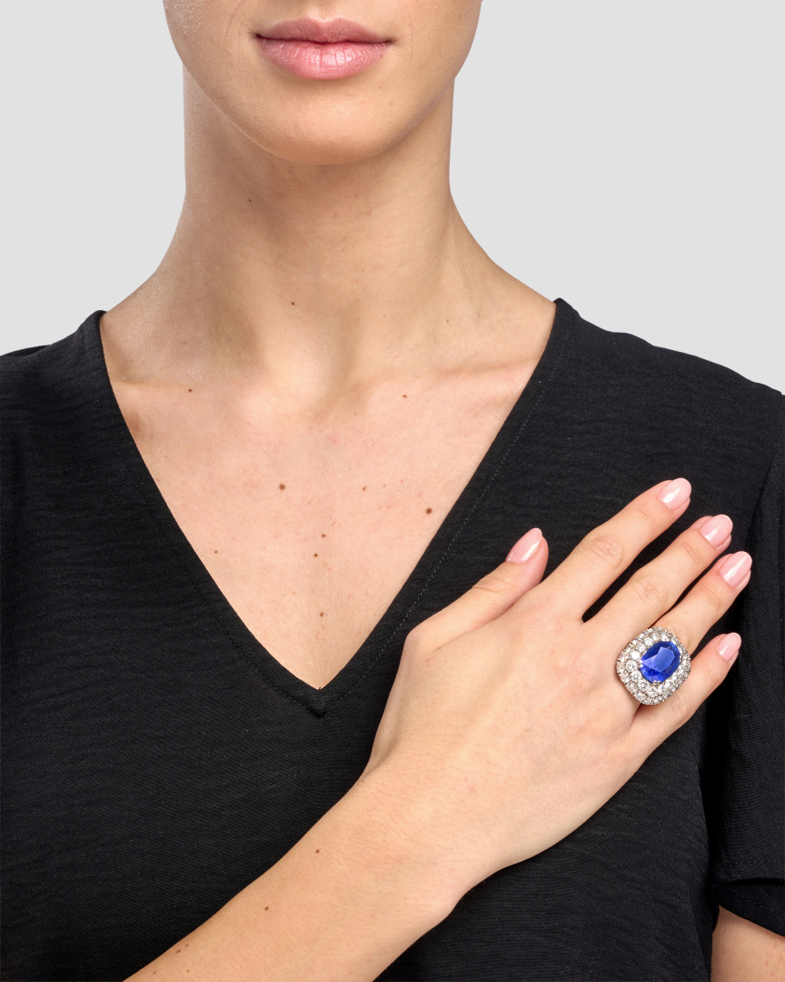 in white gold set with a central modified oval brilliant antique cushion-cut sapphire weighing 19.007 ct and round brilliant-cut diamonds weighing approx. 7.00 ct. Accompanied by Gubelin certificate from 1983 stating that the sapphire is of Sri Lankan origin. Accompanied by SSEF certificate from 2025 stating that the sapphire is natural, does not show evidence of heating, and is of Ceylon (Sri Lanka) origin.