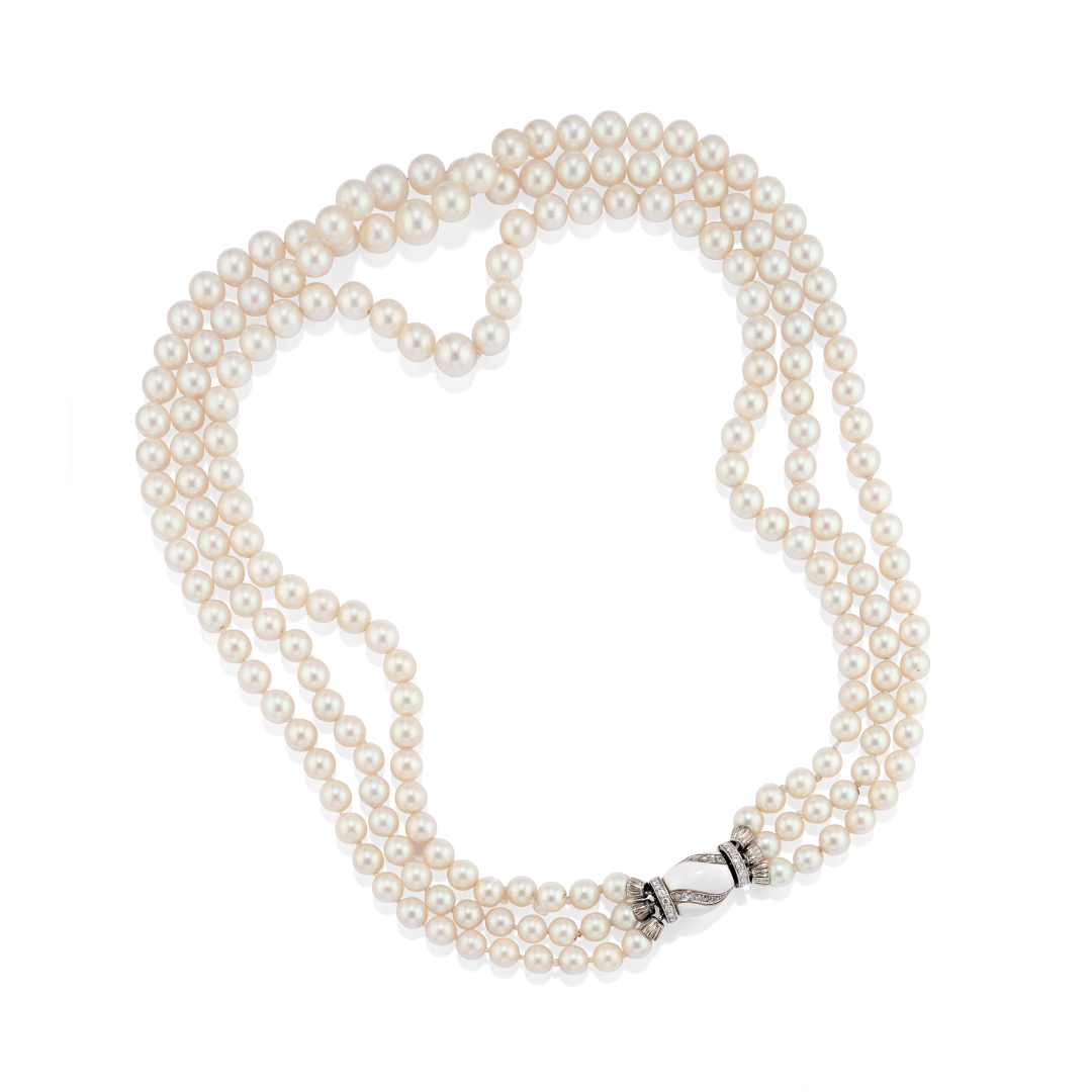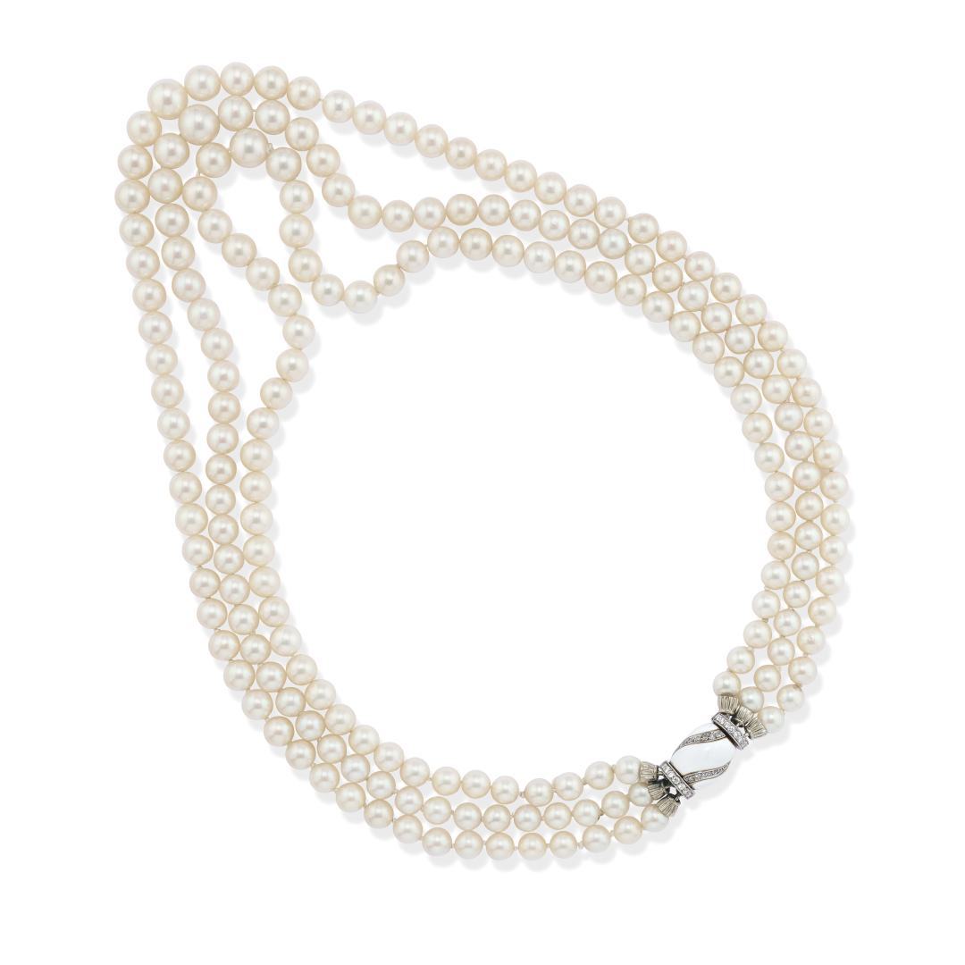 designed as three strands of pearls with a candy clasp in white enamel and small brilliant- and simple-cut diamonds. Losses to the enamel.