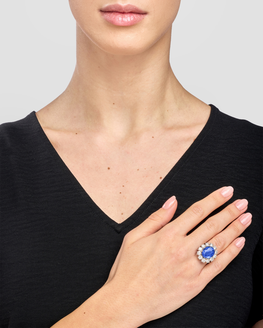 in white gold set with a sapphire weighing approx. 7.50 ct framed by round brilliant-cut diamonds weighing approx. 1.80 ct.