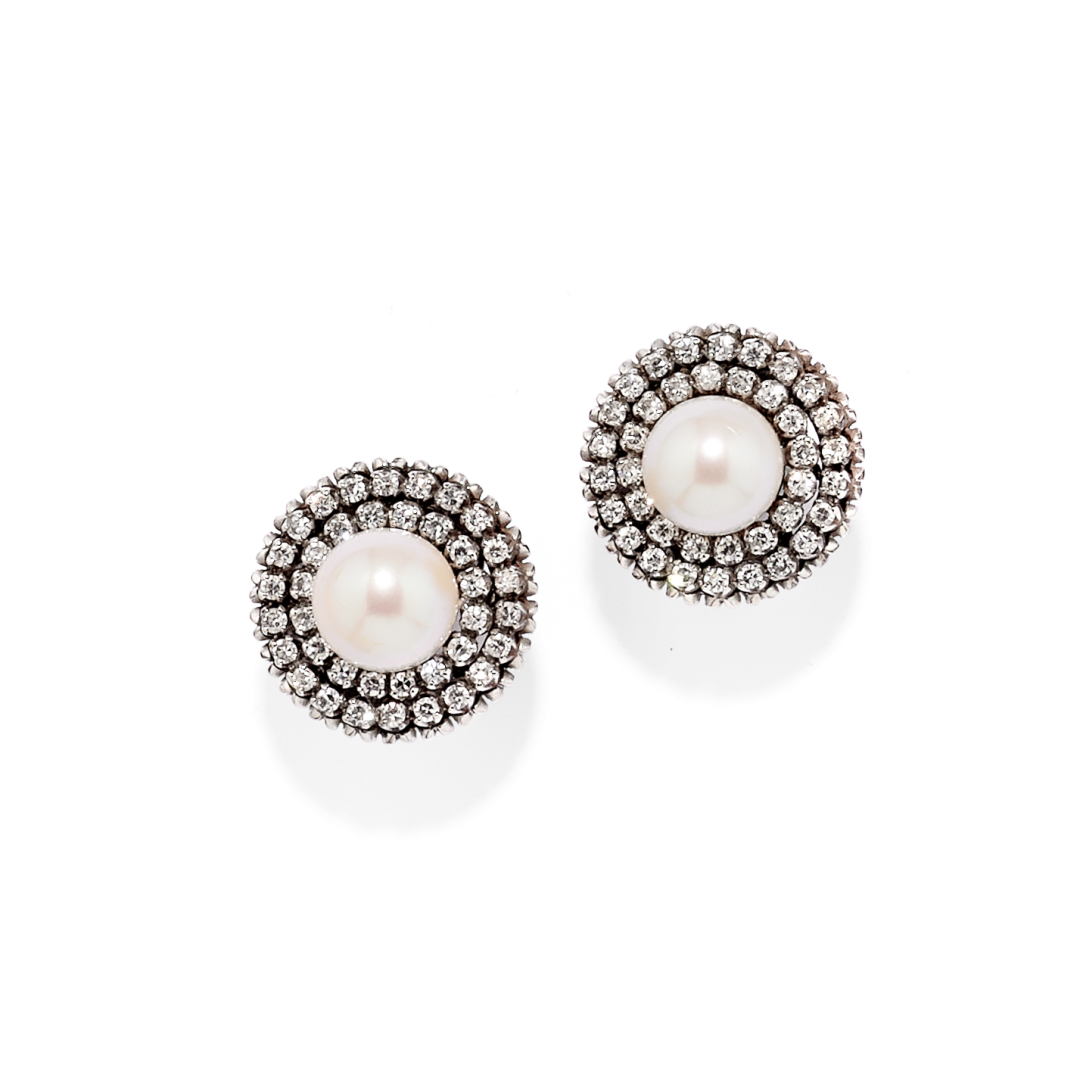 in white gold with a central pearl framed by two concentric circles of simple-cut diamonds weighing approx. 1.00 ct all together. Clip fittings.
