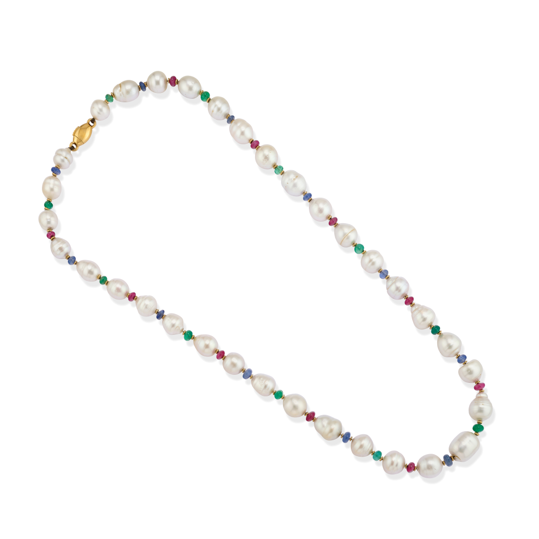 with pearls of varying sizes and shapes interspersed with pink and blue corundum and emerald beads with yellow gold rice-grain clasp.